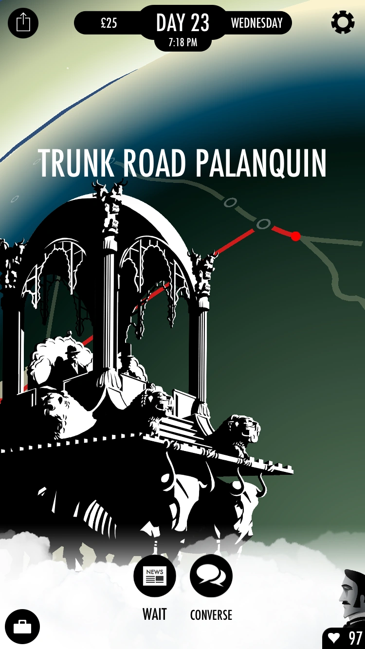 The Trunk Road Palanquin is a large, mechanical, palanquin vehicle which transports passengers along the Great Trunk Road in Western Asia. The route travels south-easterly from Kabul to Agra, passing through Lahore and Delhi.